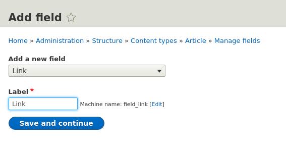 Now we're gonna figure out how it works. Let's go to the editing of the Article type content fields and add a new Link type field: